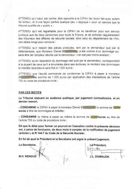 Tout d'abord pour que les choses soients claires et éviter les mensonges, vous trouverez ci joint la copie de l'appel d'offre mis en oeuvre par les dirigeants de la CIPAV concernant le recours d'un avocat spécialisé en droit pénal et la copie d'un jugement émis par le Tribunal des affaires de sécurité sociale de l'Ain qui met clairement en avant qu'il est "regrettable pour la CIPAV de ne bénéficier pour son service juridique que de deux personnes pour toute la France et de solliciter régulièrement des tribunaux des affaires de sécurité sociale, dont celui du département de l'Ain, des délais longs pour conclure".
