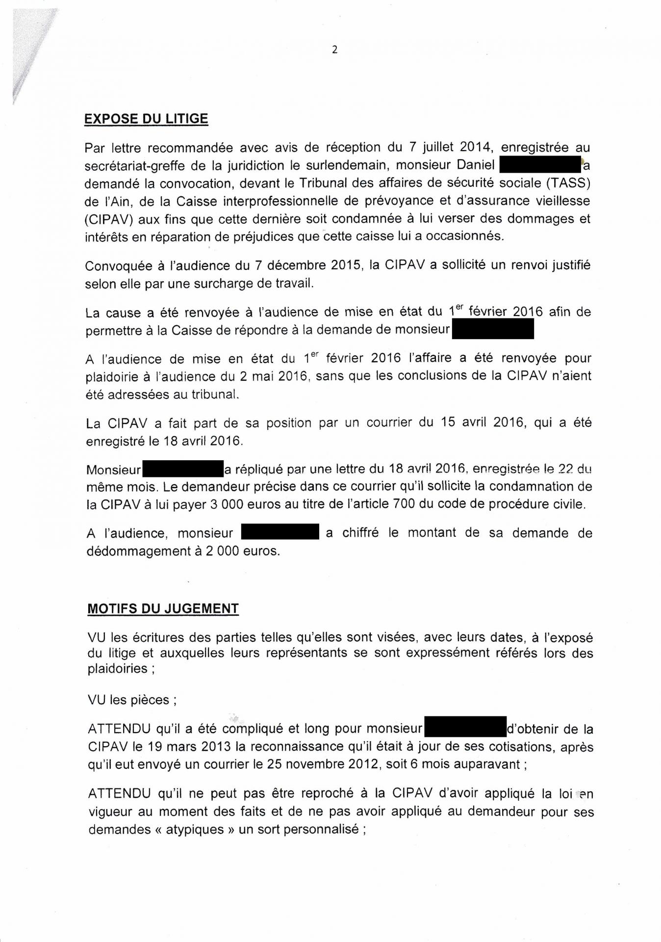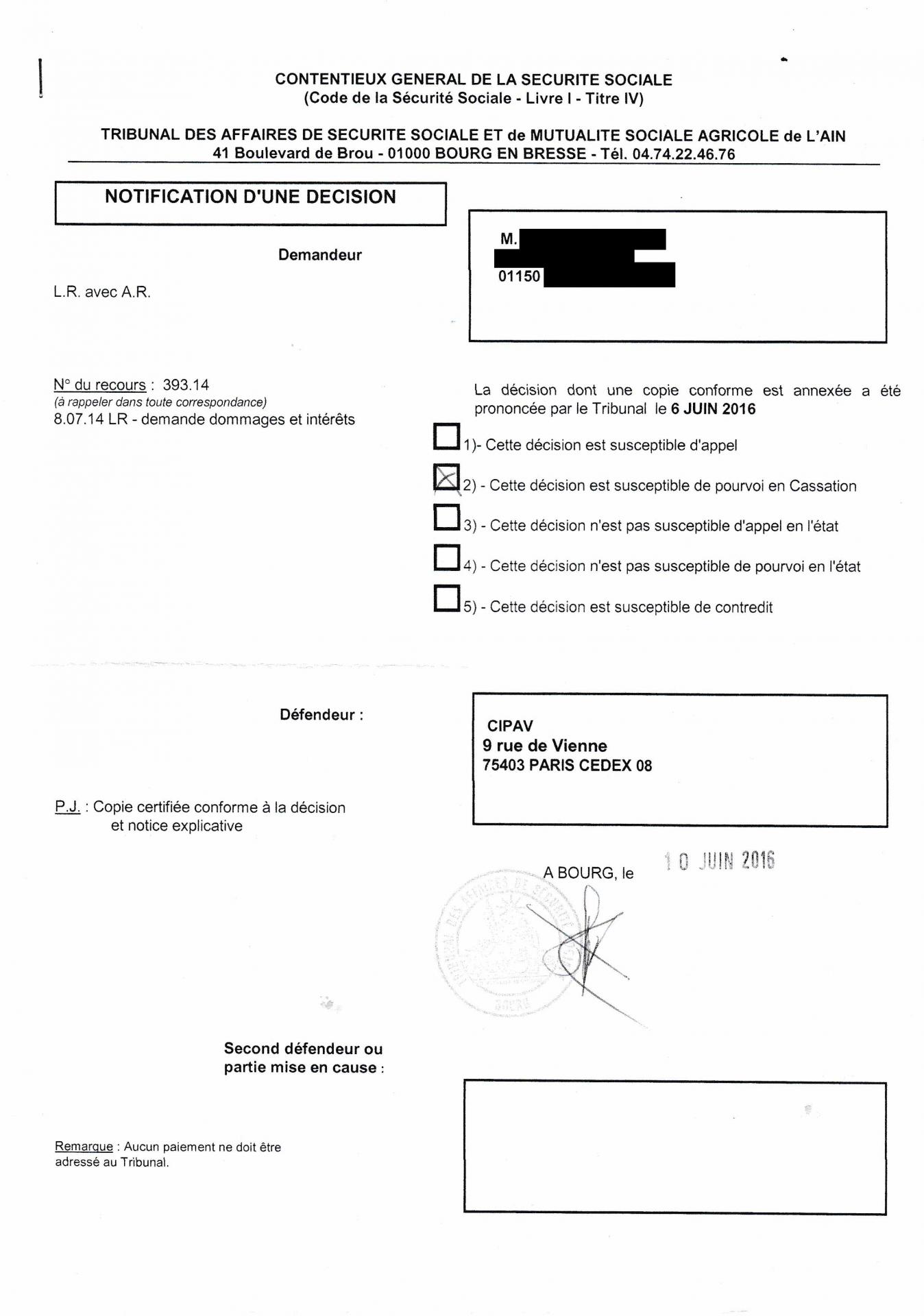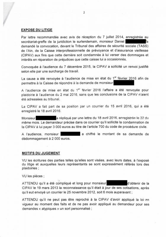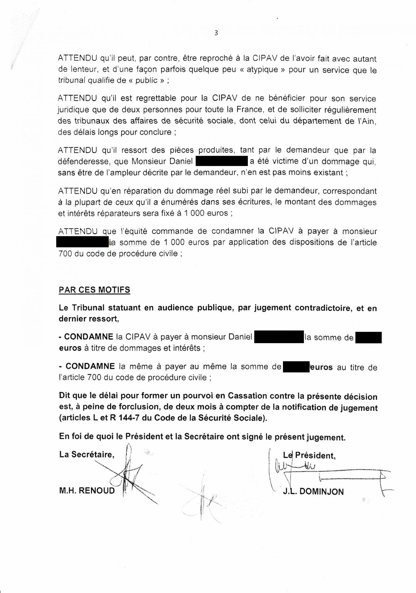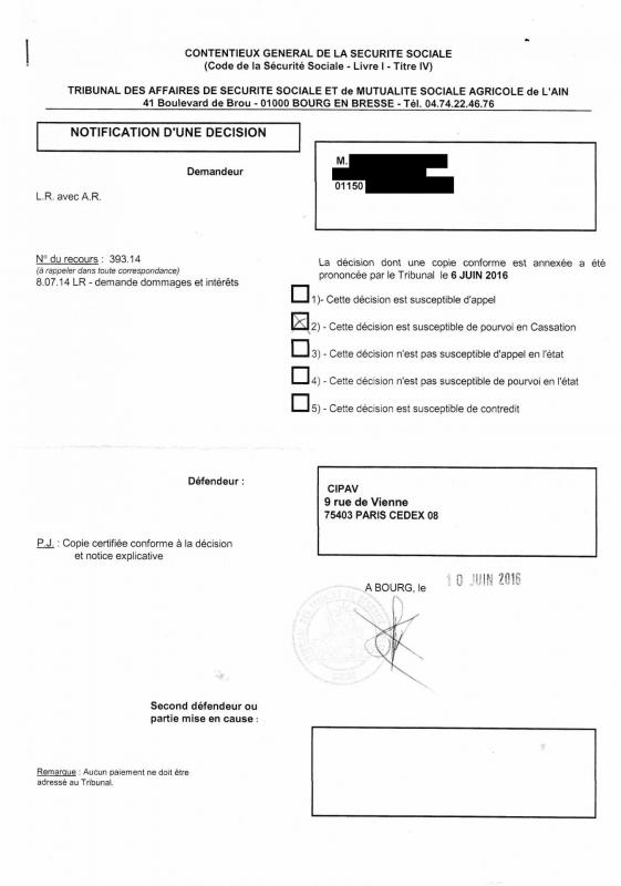 En effet, vous trouverez ci-joint la notification de décision du TASS de l'Ain que vient de recevoir un de nos adhérents, c'est édifiant et prouve sans conteste la gestion déplorable de la CIPAV.