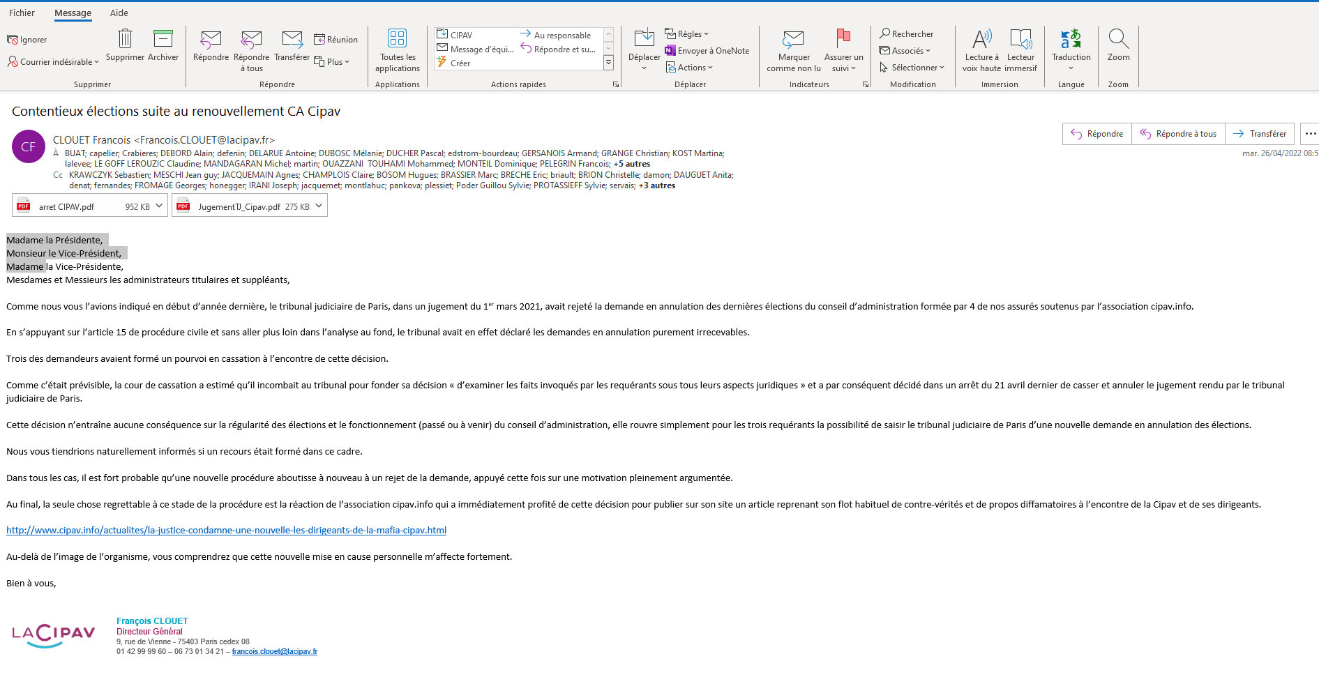 Dans ce mail d'avril 2022, François Clouet fais preuve d'incompétence, tente de manipuler les administrateurs en indiquant de fausses vérités sur les procédures en cours et tente en vain de diffamer notre collectif puisque la Cour de cassation nous a donné raison en octobre 2023.